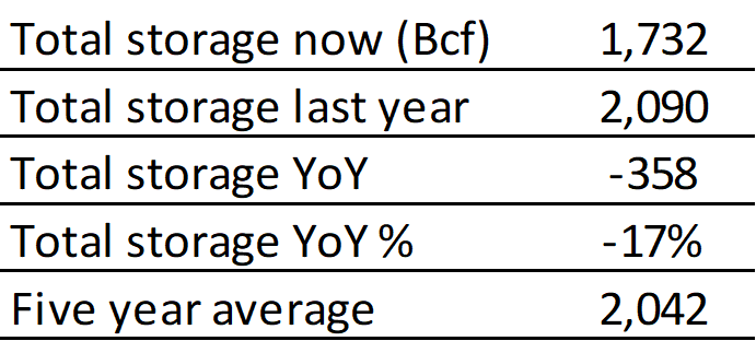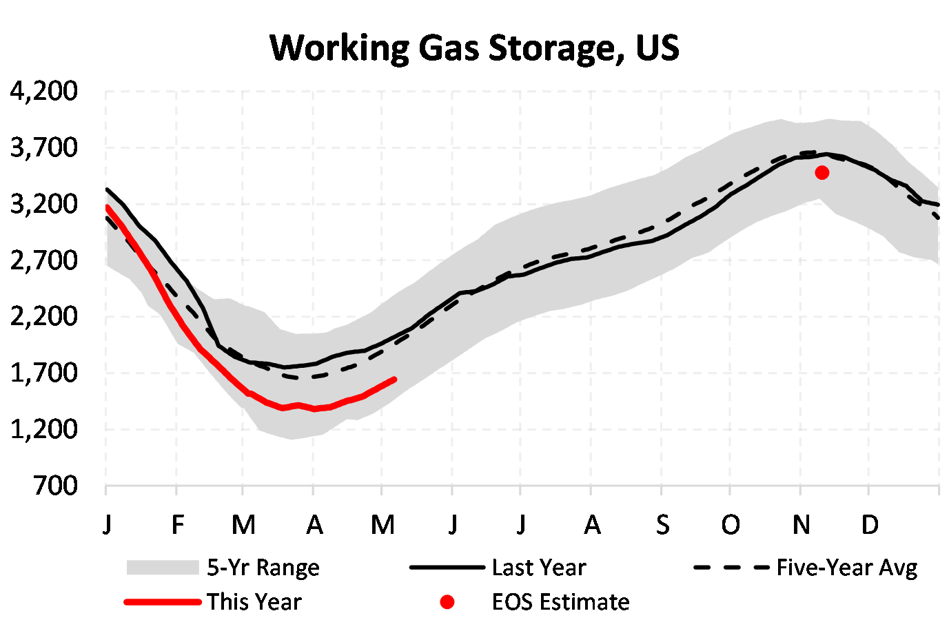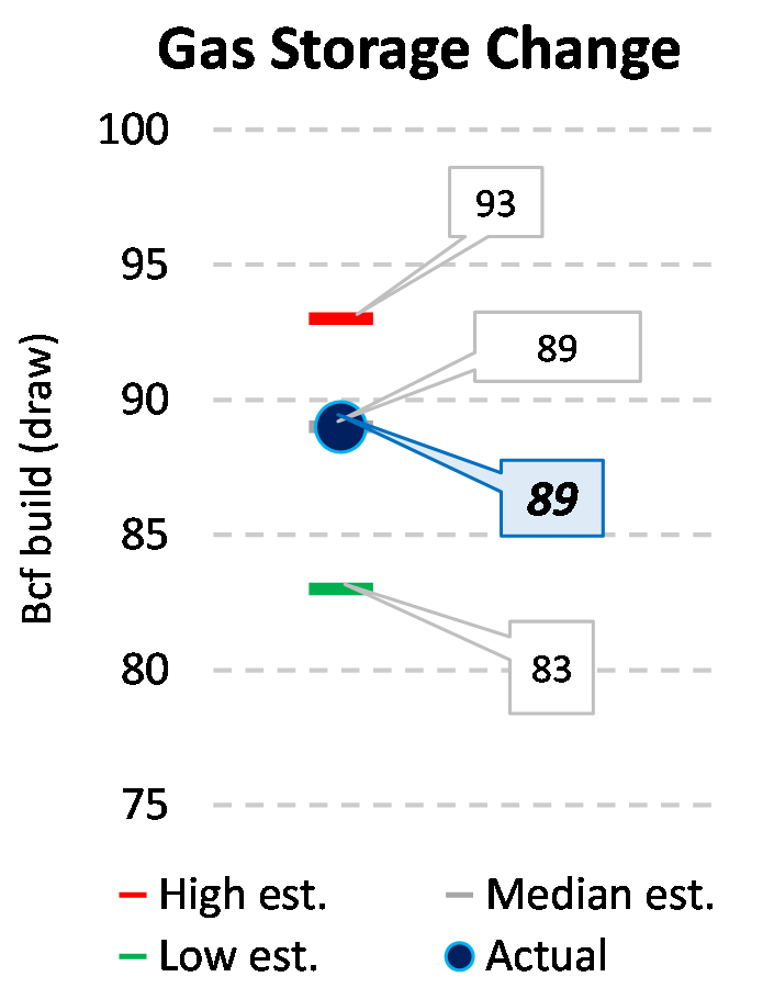 EIA reported a build of 89 Bcf for the week ending 5/13/2022. This was equal to the median estimate of 89 Bcf. Today's stat fell within the expected range, which was 93 Bcf on the more bearish end, and 83 Bcf on the more bullish end.