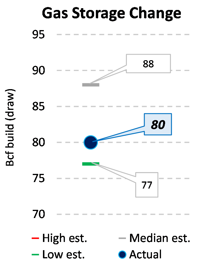EIA reported a build of 80 Bcf for the week ending 5/20/2022. This was smaller than the median estimate of 88 Bcf. Today's stat fell within the expected range, which was 103 Bcf on the more bearish end, and 77 Bcf on the more bullish end.