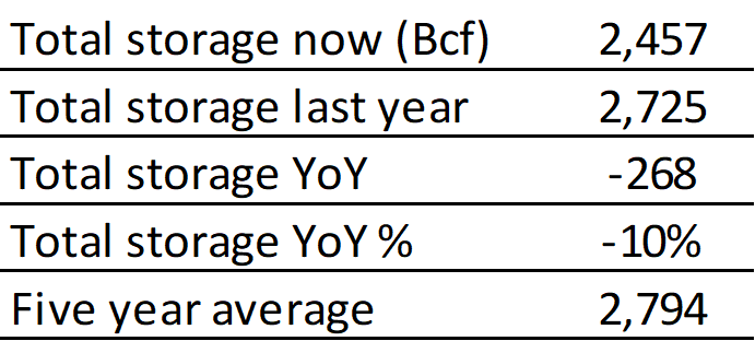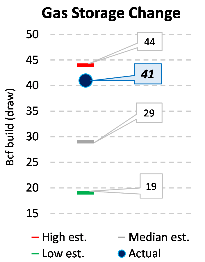 EIA reported a build of 41 Bcf for the week ending 7/29/2022. This was larger than the median estimate of 29 Bcf. Today's stat fell within the expected range, which was 44 Bcf on the more bearish end, and 19 Bcf on the more bullish end.