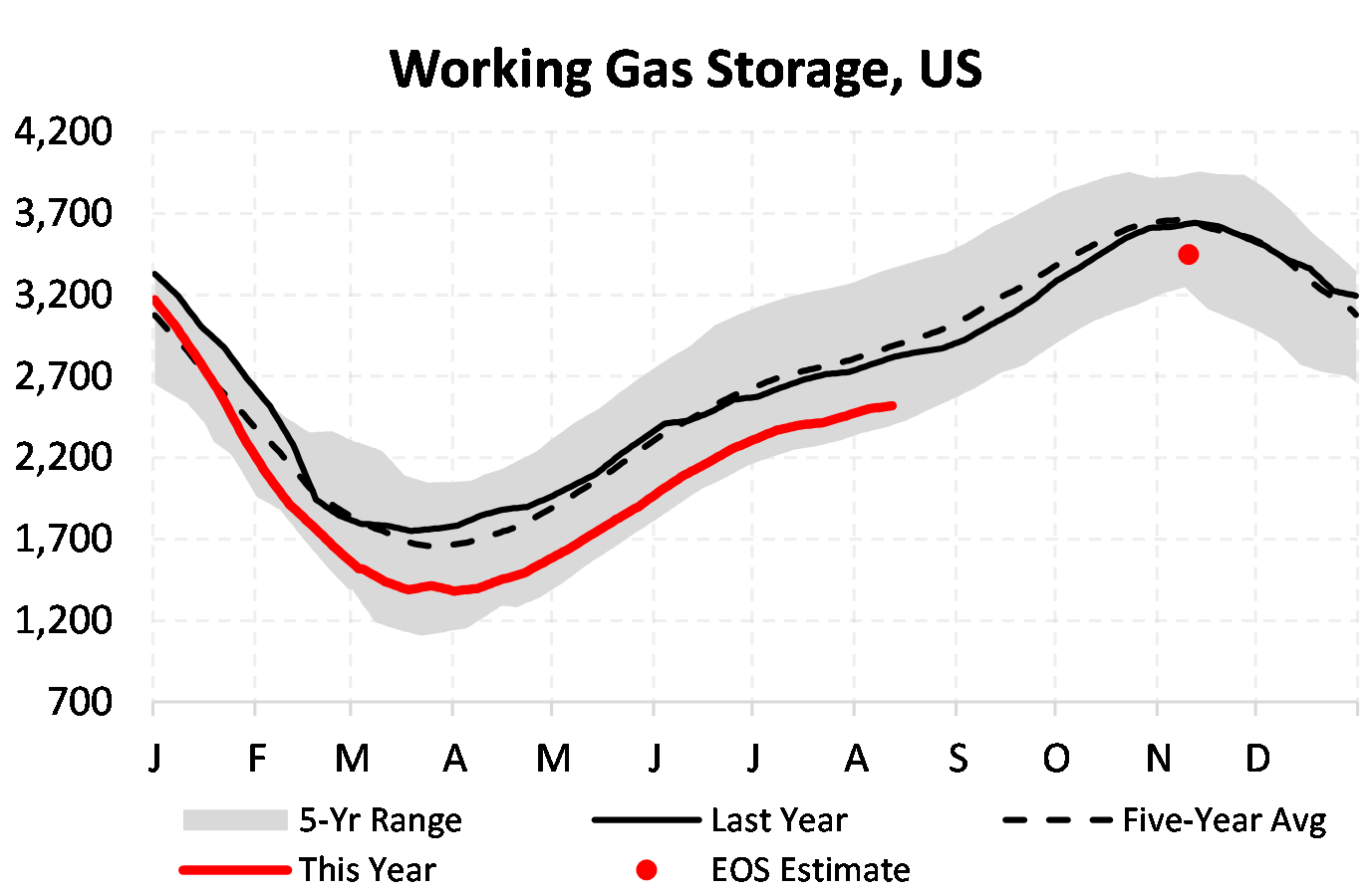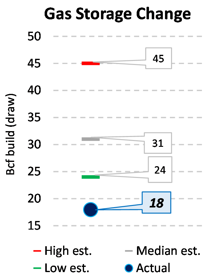 EIA reported a build of 18 Bcf for the week ending 8/12/2022. This was smaller than the median estimate of 31 Bcf. Today's stat fell outside the expected range, which was 45 Bcf on the more bearish end, and 24 Bcf on the more bullish end.