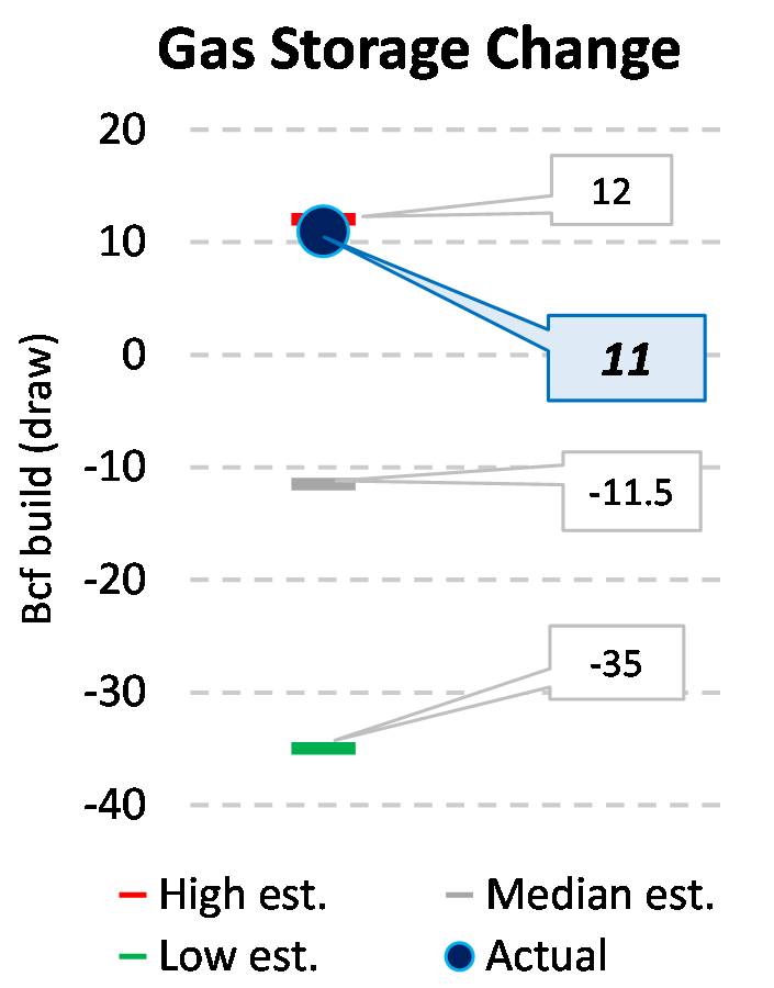 EIA reported a build of 11 Bcf for the week ending 1/06/2023. This was smaller than the median estimate of -11.5 Bcf. Today's stat fell within the expected range, which was 12 Bcf on the more bearish end, and -35 Bcf on the more bullish end.