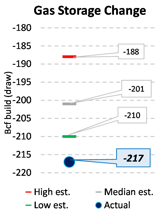 EIA reported a draw of -217 Bcf for the week ending 2/03/2023. This was larger than the median estimate of -201 Bcf. Today's stat fell outside the expected range, which was -188 Bcf on the more bearish end, and -210 Bcf on the more bullish end.