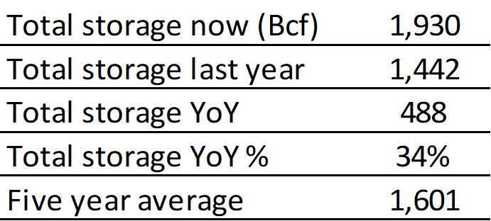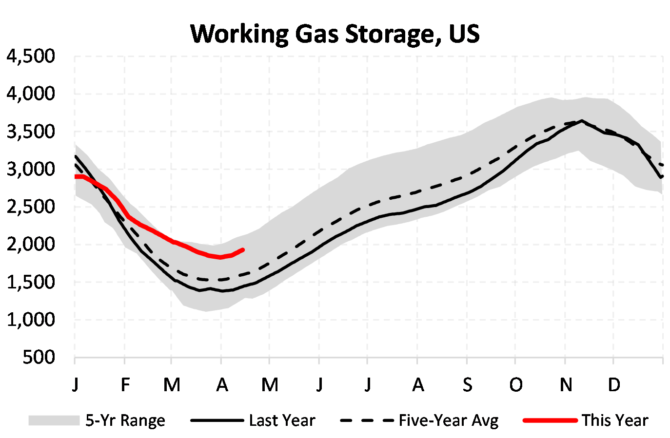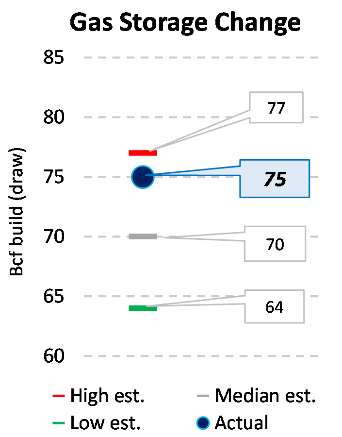 EIA reported a build of 75 Bcf for the week ending 4/14/2023. This was larger than the median estimate of 70 Bcf. Today's stat fell within the expected range, which was 77 Bcf on the more bearish end, and 64 Bcf on the more bullish end.