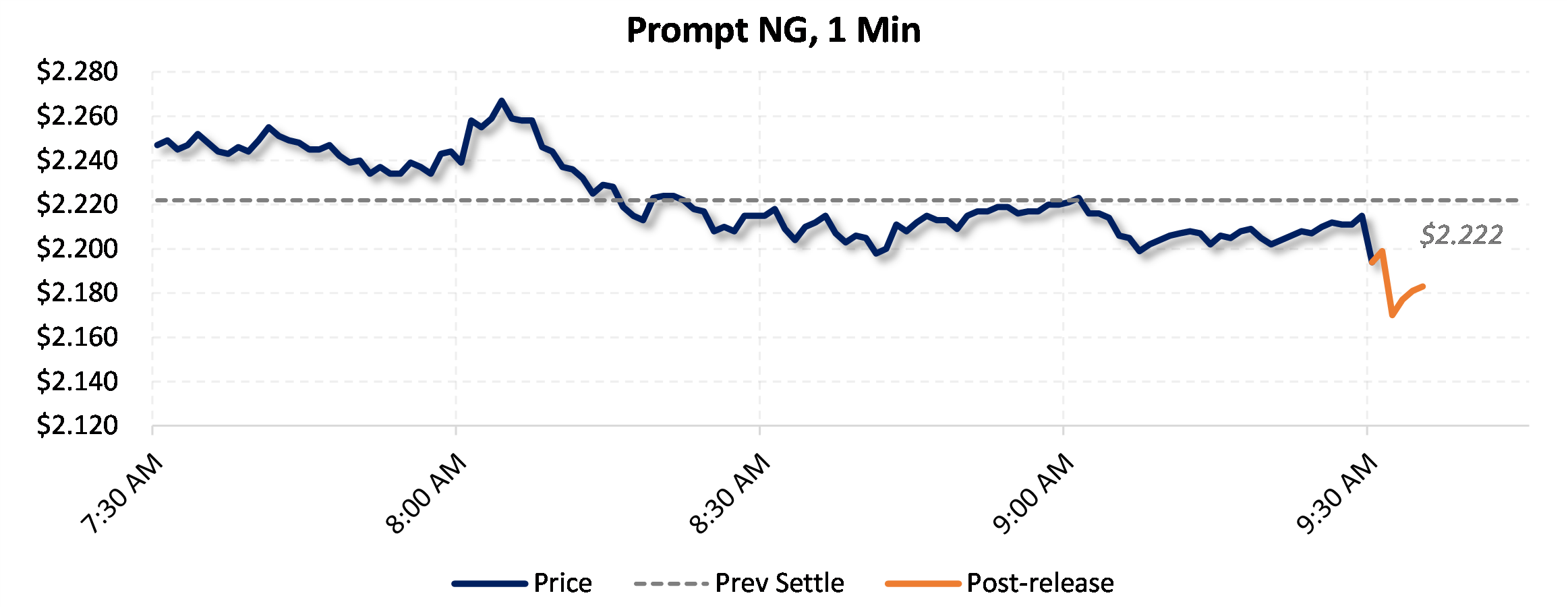 Prices were down in the five minutes following the announcement, to $2.184, from $2.211 just before 9:30am.