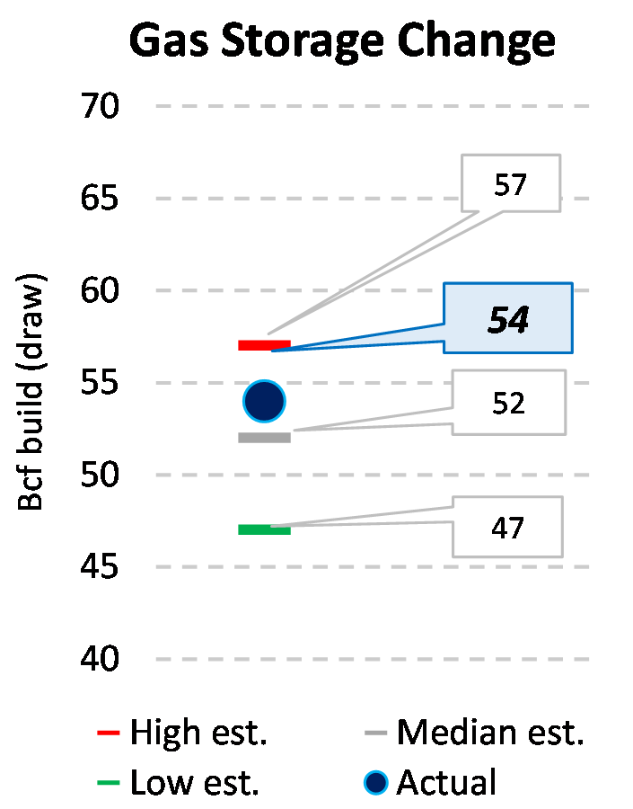 EIA reported a build of 54 Bcf for the week ending 4/28/2023. This was larger than the median estimate of 52 Bcf. Today's stat fell within the expected range, which was 57 Bcf on the more bearish end, and 47 Bcf on the more bullish end.