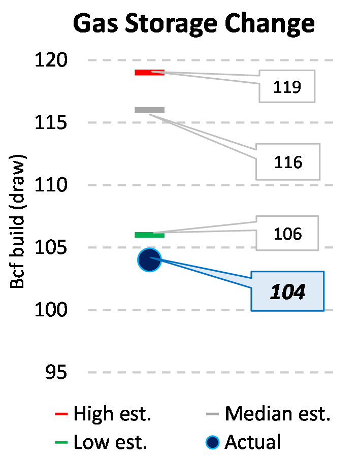 EIA reported a build of 104 Bcf for the week ending 6/02/2023. This was smaller than the median estimate of 116 Bcf. Today's stat fell outside the expected range, which was 119 Bcf on the more bearish end, and 106 Bcf on the more bullish end.