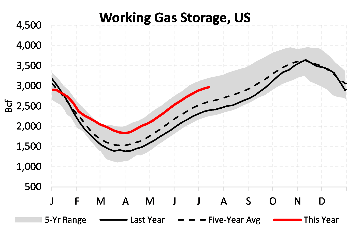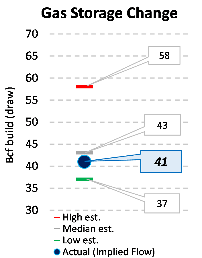 EIA reported a build of 41 Bcf for the week ending 7/14/2023. This was smaller than the median estimate of 43 Bcf. Today's stat fell within the expected range, which was 58 Bcf on the more bearish end, and 37 Bcf on the more bullish end.