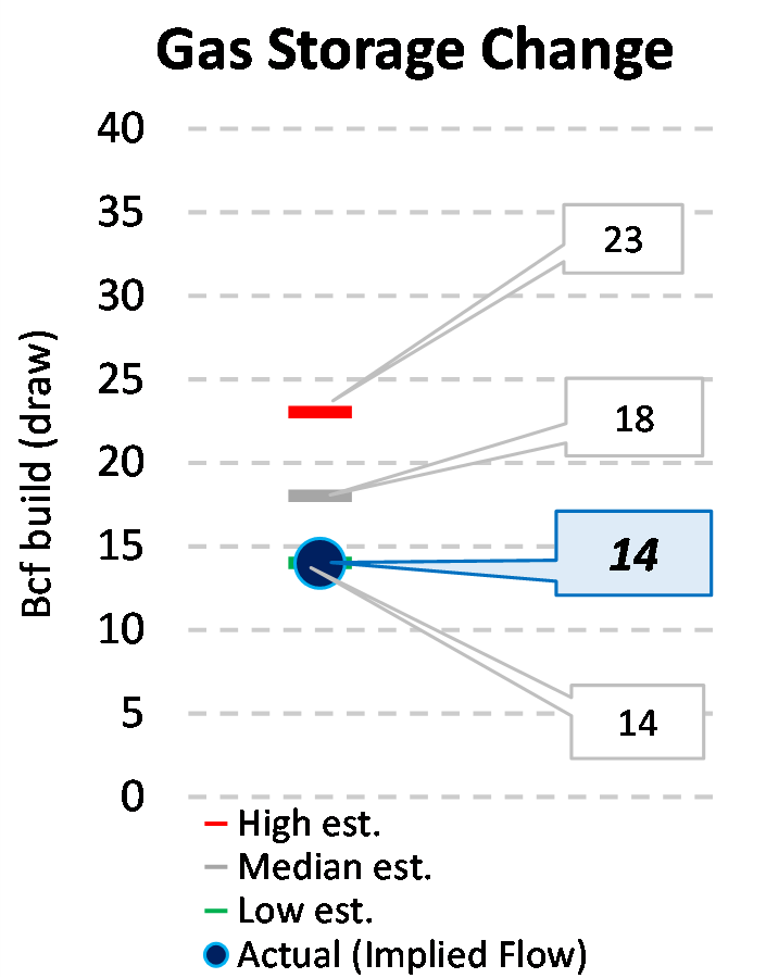 EIA reported a build of 14 Bcf for the week ending 7/28/2023. This was smaller than the median estimate of 18 Bcf. Today's stat fell within the expected range, which was 23 Bcf on the more bearish end, and 14 Bcf on the more bullish end.