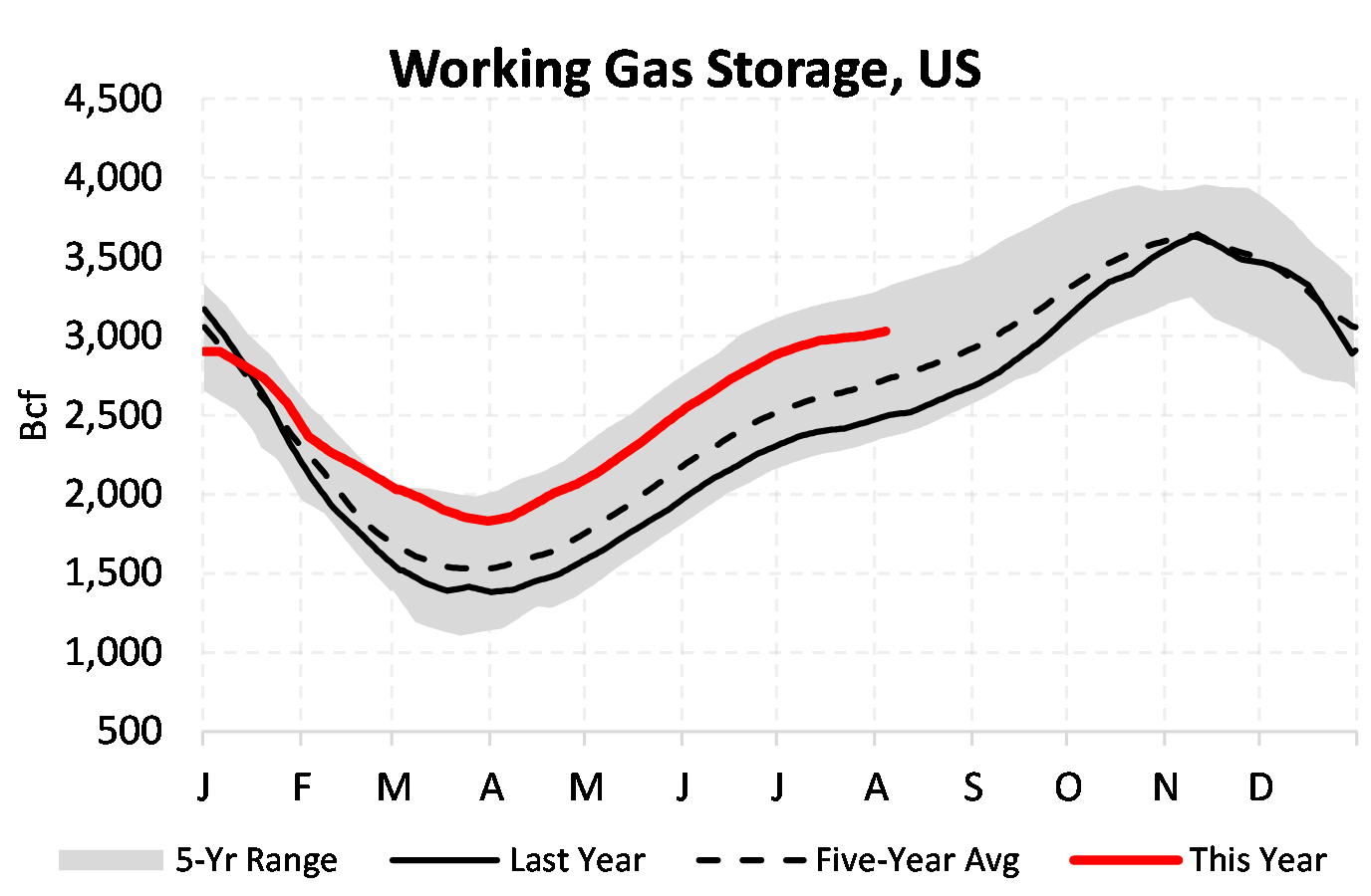 EIA reported a build of 29 Bcf for the week ending 8/04/2023. This was larger than the median estimate of 23 Bcf. Today's stat fell within the expected range, which was 31 Bcf on the more bearish end, and 21 Bcf on the more bullish end.