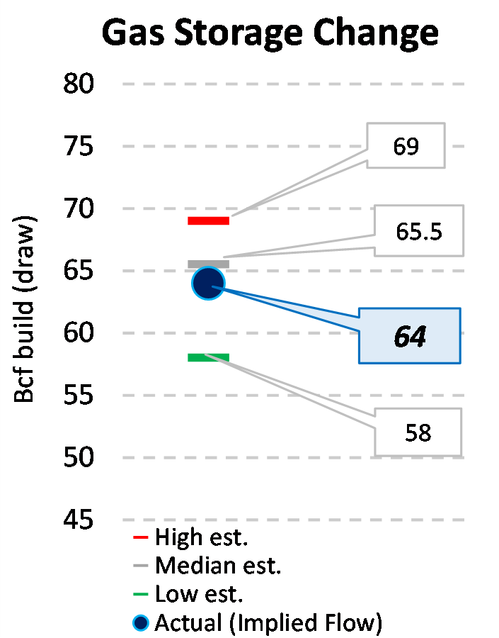 EIA reported a build of 64 Bcf for the week ending 9/15/2023. This was smaller than the median estimate of 65.5 Bcf. Today's stat fell within the expected range, which was 69 Bcf on the more bearish end, and 58 Bcf on the more bullish end.