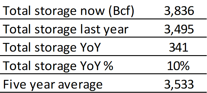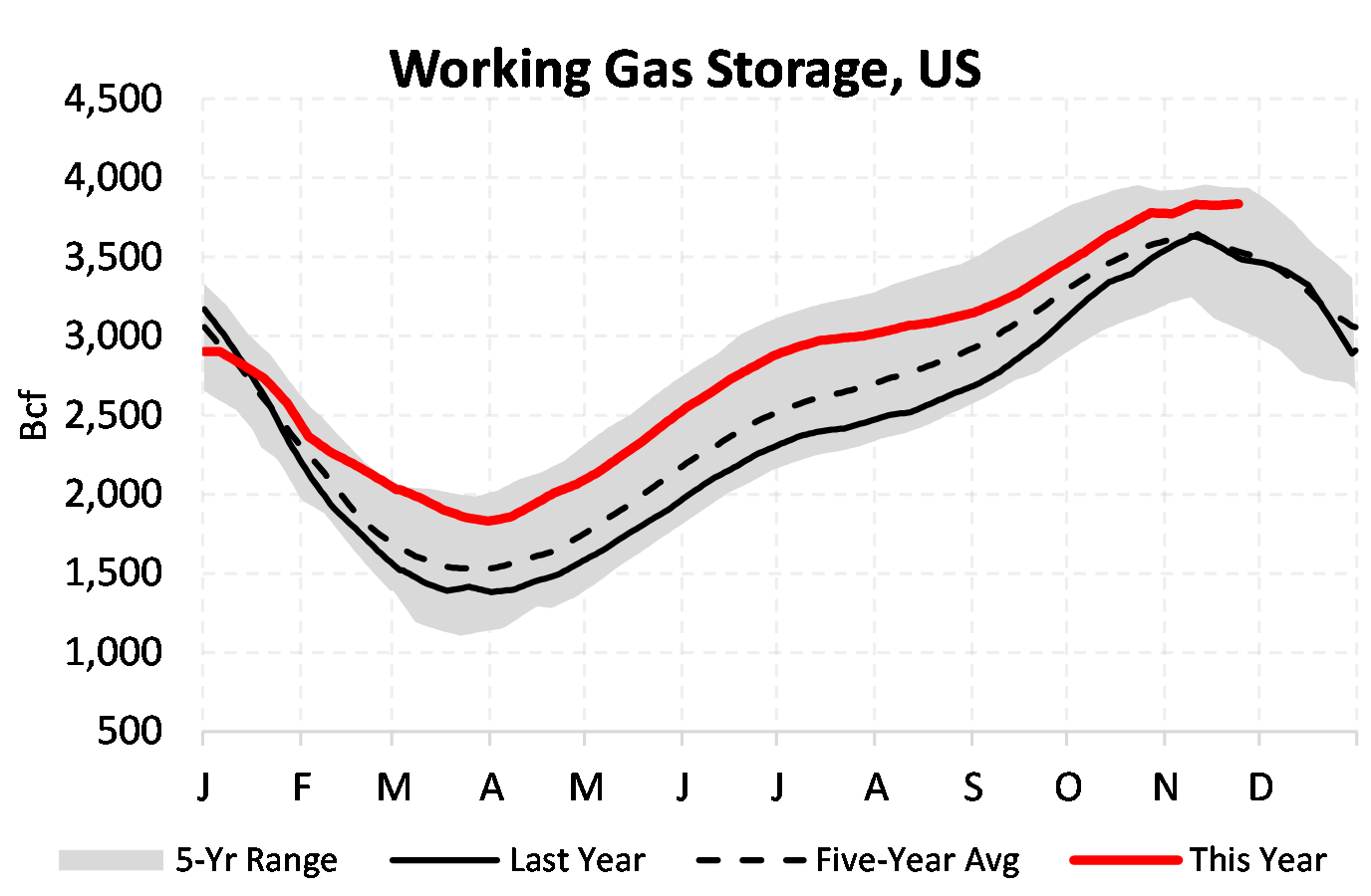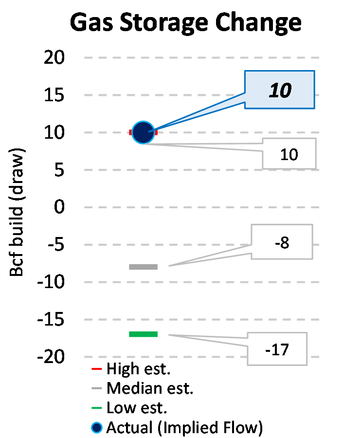 EIA reported a build of 10 Bcf for the week ending 11/24/2023. This was larger than the median estimate of -8 Bcf. Today's stat fell within the expected range, which was 10 Bcf on the more bearish end, and -17 Bcf on the more bullish end.