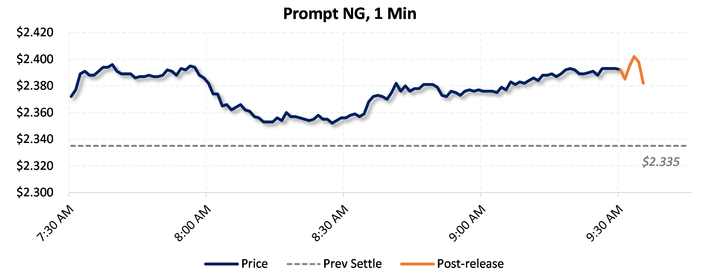 Prices were down in the five minutes following the announcement, to $2.366, from $2.393 just before 9:30am.