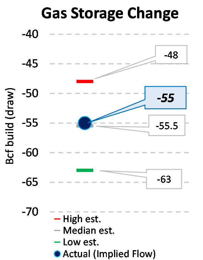 EIA reported a draw of -55 Bcf for the week ending 12/08/2023. This was smaller than the median estimate of -55.5 Bcf. Today's stat fell within the expected range, which was -48 Bcf on the more bearish end, and -63 Bcf on the more bullish end.