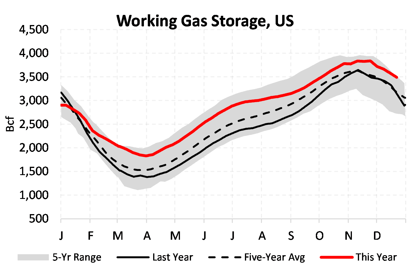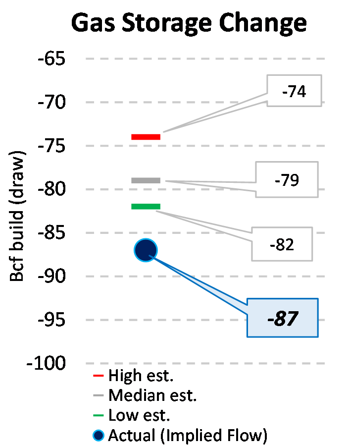 EIA reported a draw of -87 Bcf for the week ending 12/22/2023. This was larger than the median estimate of -79 Bcf. Today's stat fell outside the expected range, which was -74 Bcf on the more bearish end, and -82 Bcf on the more bullish end.
