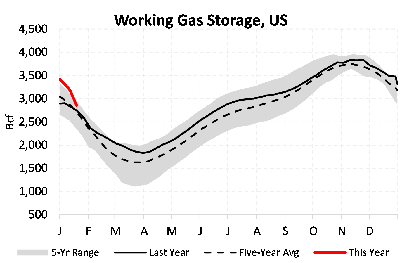 EIA reported a draw of -326 Bcf for the week ending 1/19/2024. This was larger than the median estimate of -318 Bcf. Today's stat fell within the expected range, which was -295 Bcf on the more bearish end, and -341 Bcf on the more bullish end.
