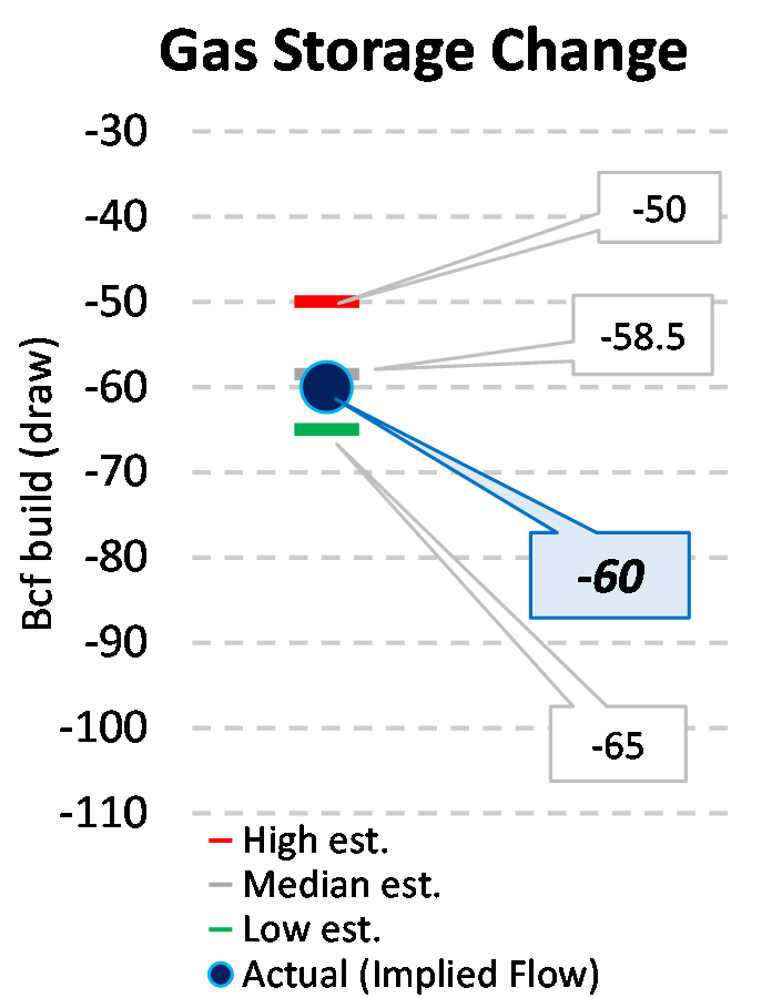 EIA reported a draw of -60 Bcf for the week ending 2/16/2024. This was larger than the median estimate of -58.5 Bcf. Today's stat fell within the expected range, which was -50 Bcf on the more bearish end, and -65 Bcf on the more bullish end.