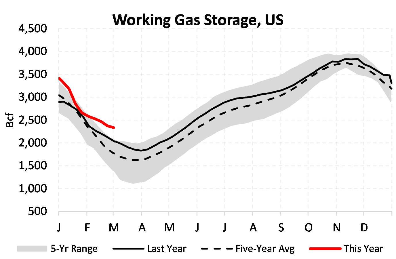 EIA reported a draw of -40 Bcf for the week ending 3/01/2024. This was larger than the median estimate of -36.5 Bcf. Today's stat fell within the expected range, which was -31 Bcf on the more bearish end, and -43 Bcf on the more bullish end.