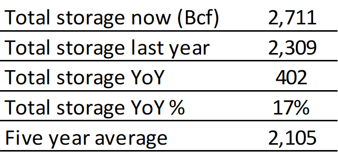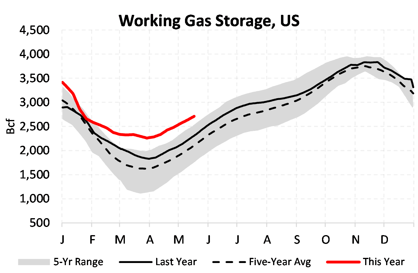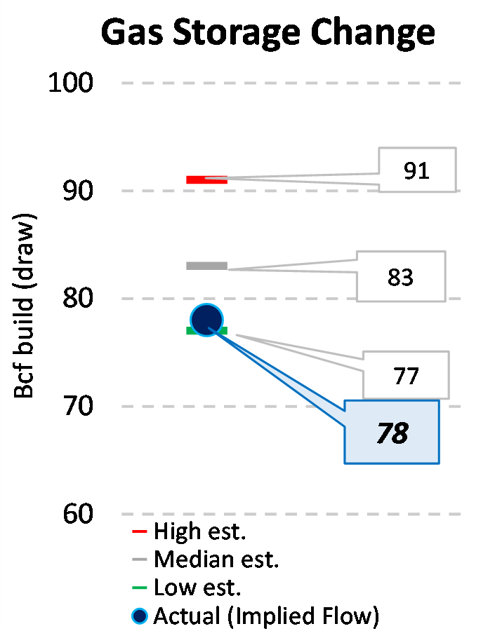 EIA reported a build of 78 Bcf for the week ending 5/17/2024. This was smaller than the median estimate of 83 Bcf. Today's stat fell within the expected range, which was 91 Bcf on the more bearish end, and 77 Bcf on the more bullish end.