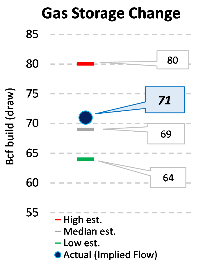 EIA reported a build of 71 Bcf for the week ending 6/14/2024. This was larger than the median estimate of 69 Bcf. Today's stat fell within the expected range, which was 80 Bcf on the more bearish end, and 64 Bcf on the more bullish end.