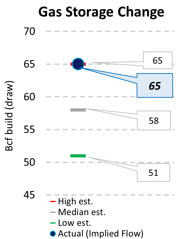 EIA reported a build of 65 Bcf for the week ending 7/05/2024. This was larger than the median estimate of 58 Bcf. Today's stat fell within the expected range, which was 65 Bcf on the more bearish end, and 51 Bcf on the more bullish end.