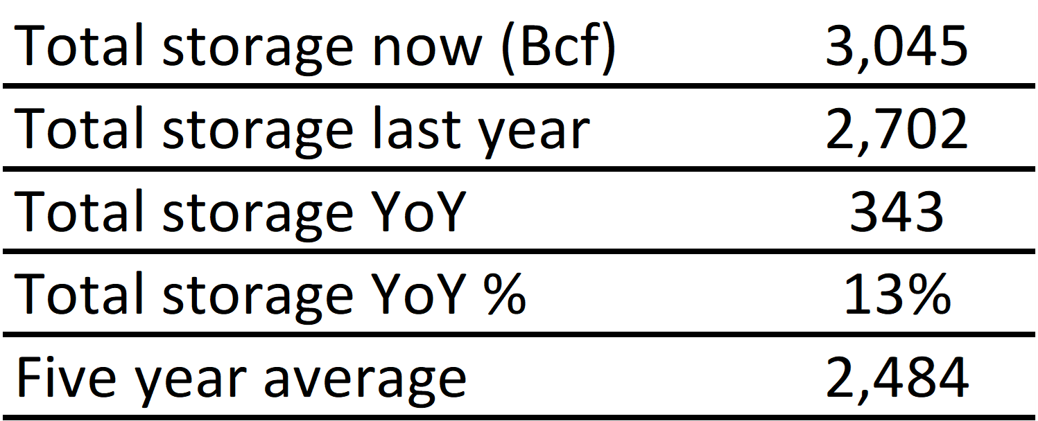 Inventories for the US are now at a surplus of 343 Bcf to last year and a surplus of 561 Bcf to the five-year average.
