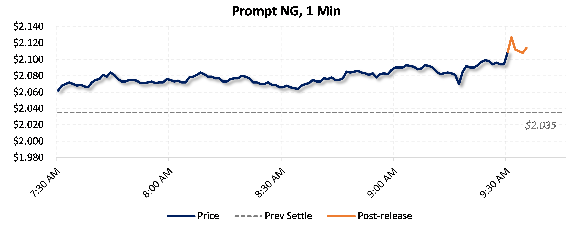 Prices were modestly higher in the five minutes following the announcement, to $2.101, from $2.094 just before 9:30am.