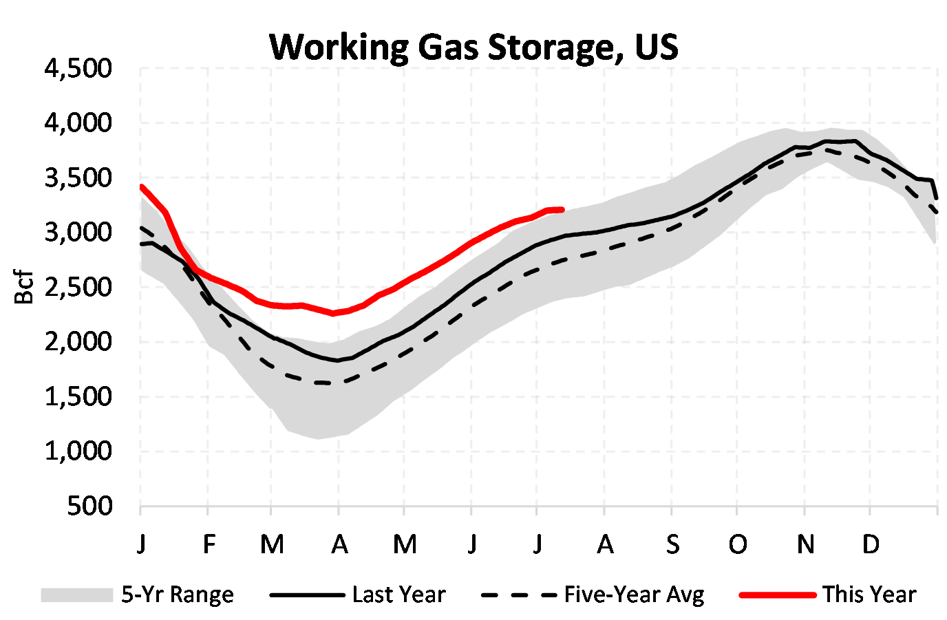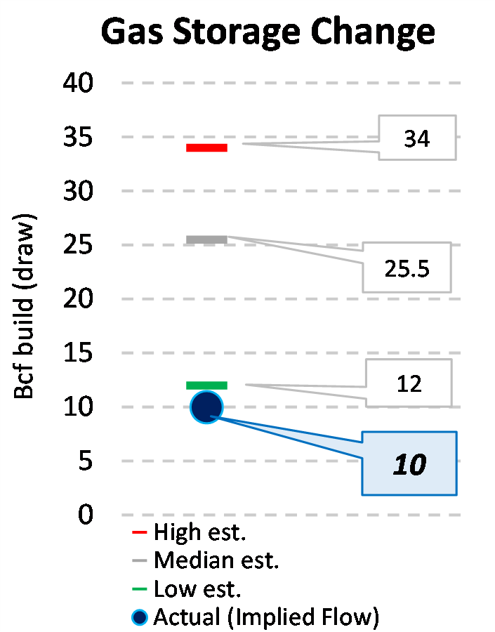 EIA reported a build of 10 Bcf for the week ending 7/12/2024. This was smaller than the median estimate of 25.5 Bcf. Today's stat fell outside the expected range, which was 34 Bcf on the more bearish end, and 12 Bcf on the more bullish end.