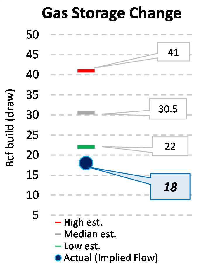 EIA reported a build of 18 Bcf for the week ending 7/26/2024. This was smaller than the median estimate of 30.5 Bcf. Today's stat fell outside the expected range, which was 41 Bcf on the more bearish end, and 22 Bcf on the more bullish end.