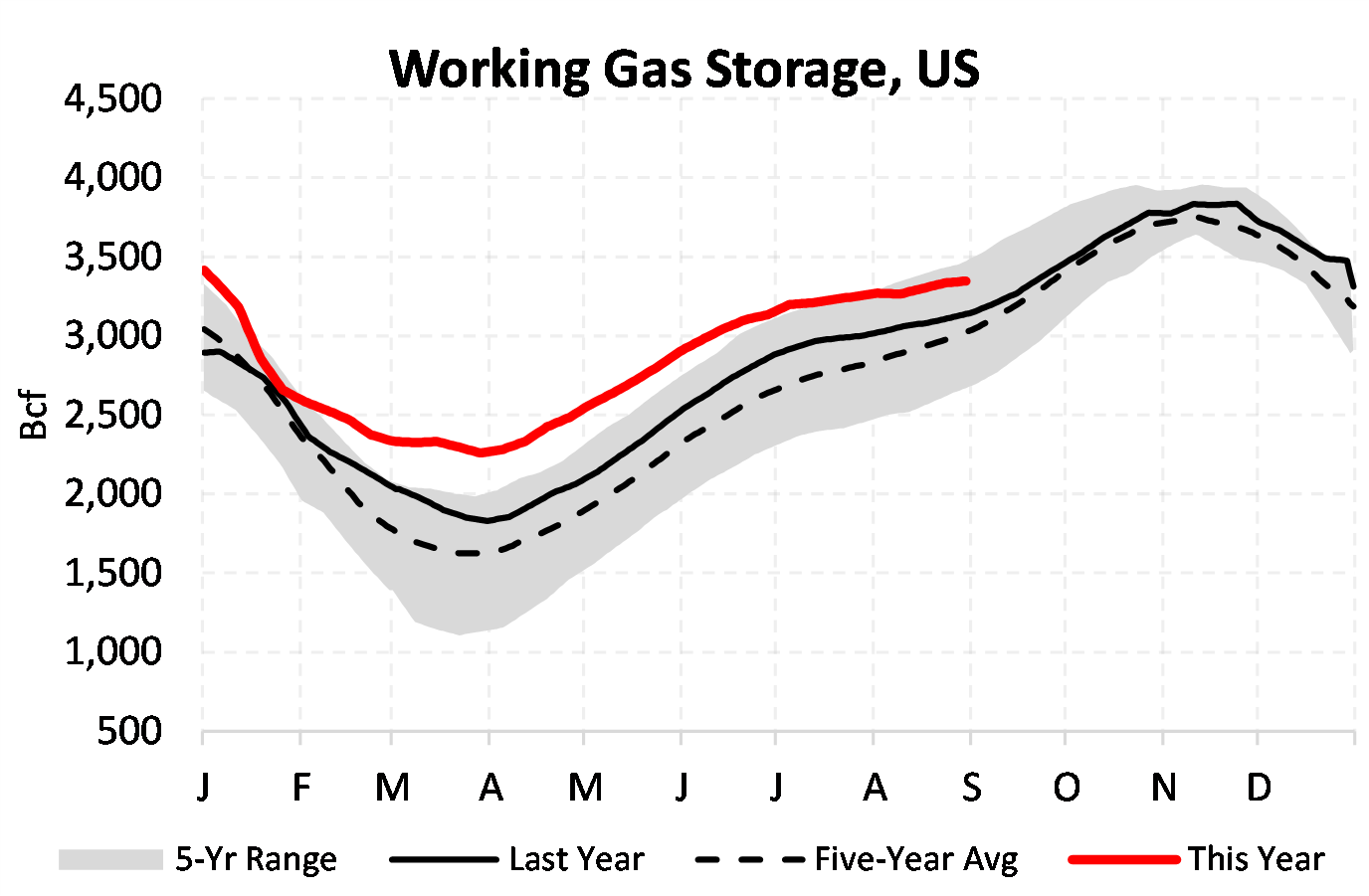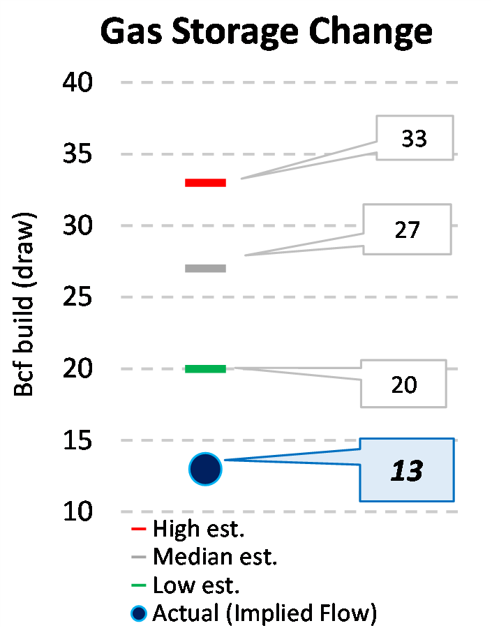 EIA reported a build of 13 Bcf for the week ending 8/30/2024. This was smaller than the median estimate of 27 Bcf. Today's stat fell outside the expected range, which was 33 Bcf on the more bearish end, and 20 Bcf on the more bullish end.