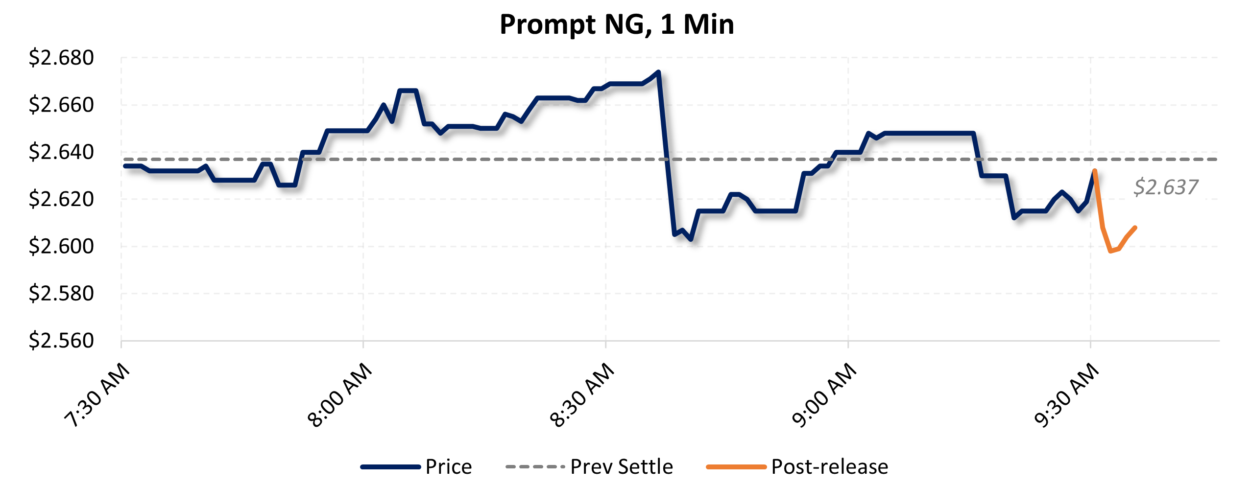 Prices were down in the five minutes following the announcement, to $2.608, from $2.615 just before 9:30am.