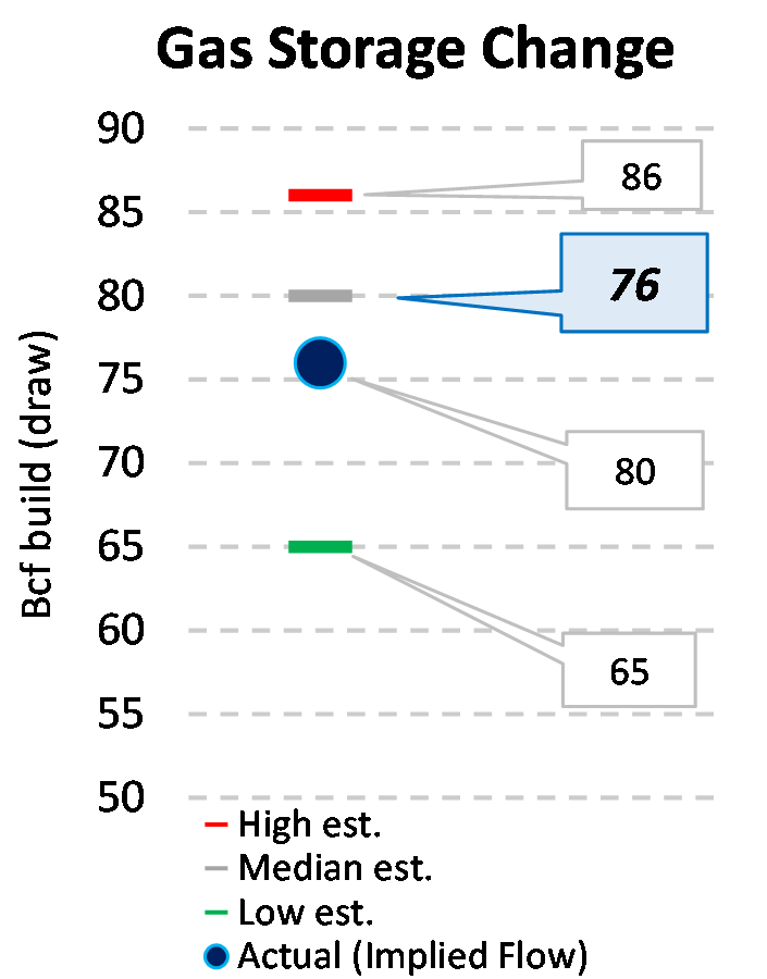 EIA reported a build of 76 Bcf for the week ending 10/11/2024. This was smaller than the median estimate of 80 Bcf. Today's stat fell within the expected range, which was 86 Bcf on the more bearish end, and 65 Bcf on the more bullish end.