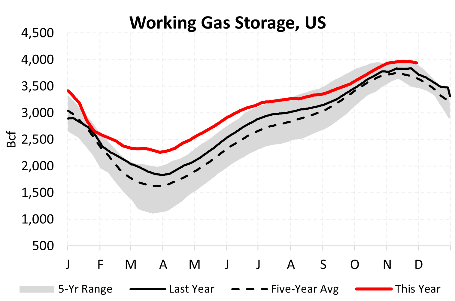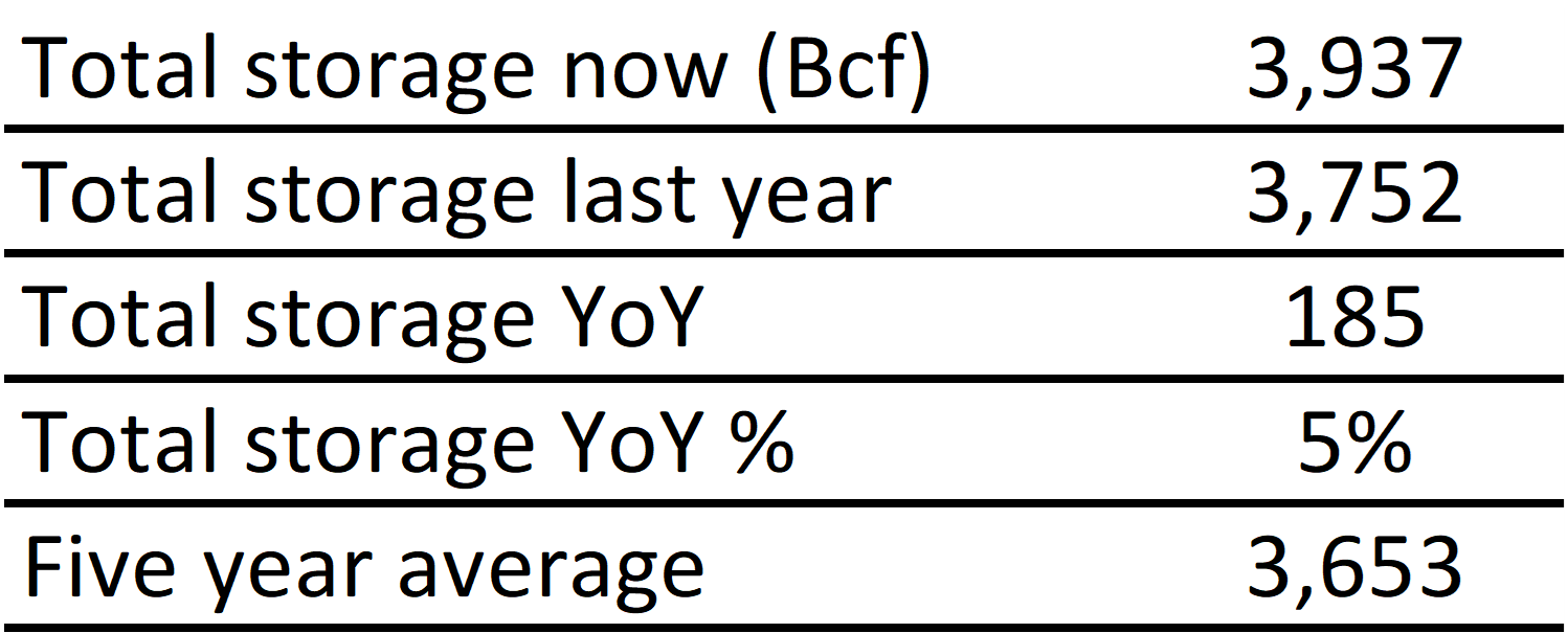 Inventories for the US are now at a surplus of 185 Bcf to last year and a surplus of 284 Bcf to the five-year average.