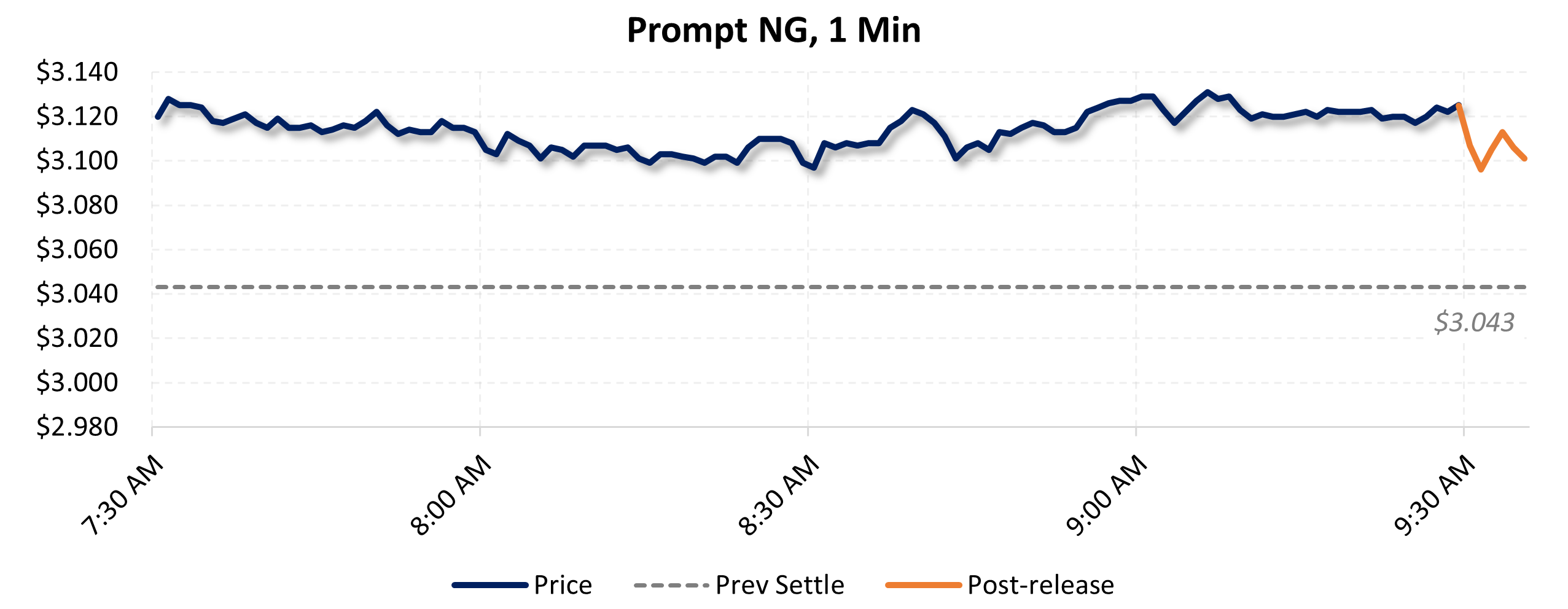 Prices were down in the five minutes following the announcement, to $3.106, from $3.125 just before 9:30am.
