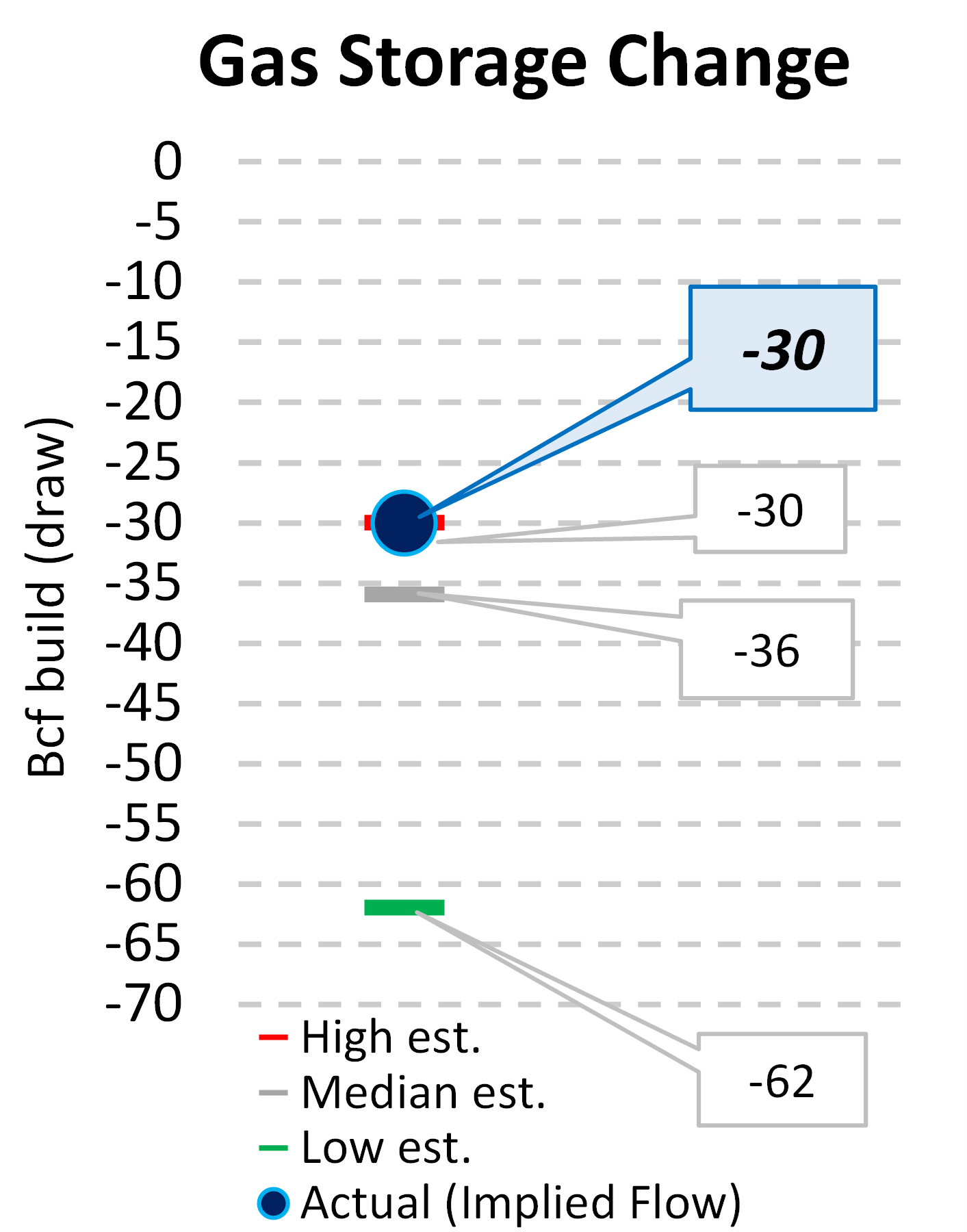EIA reported a draw of -30 Bcf for the week ending 11/29/2024. Today's stat fell within the expected range, which was -30 Bcf on the more bearish end, and -62 Bcf on the more bullish end. This was smaller than the median estimate of -36 Bcf.