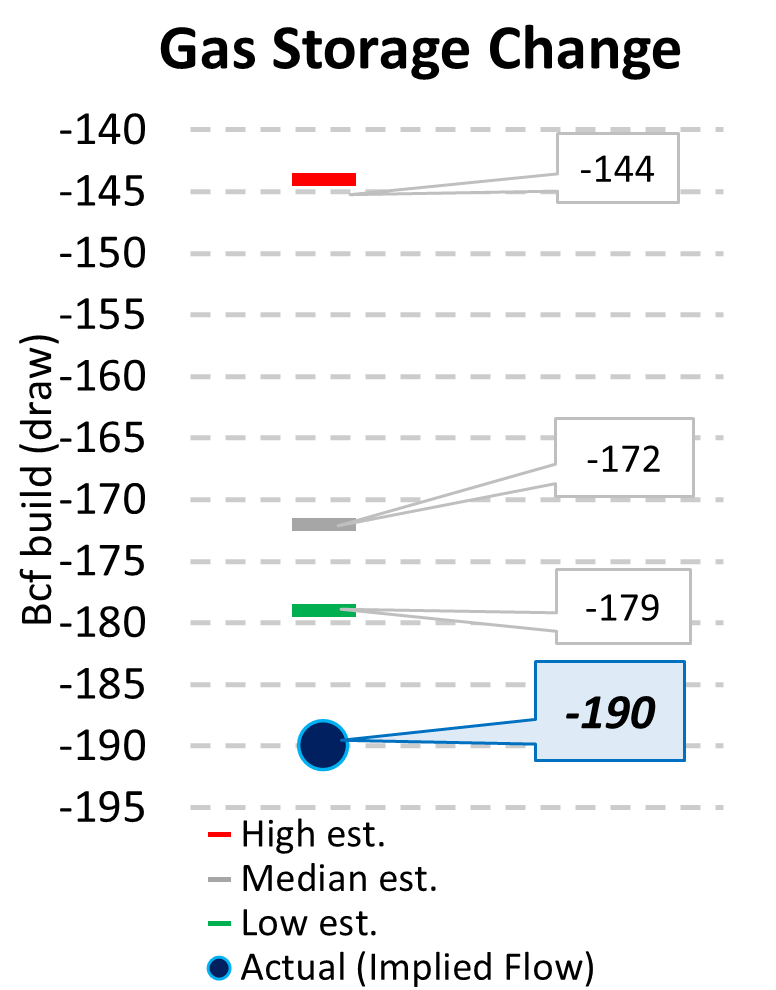 EIA reported a draw of -190 Bcf for the week ending 11/29/2024. Today's stat fell outside the expected range, which was -144 Bcf on the more bearish end, and -179 Bcf on the more bullish end. This was larger than the median estimate of -172 Bcf.
