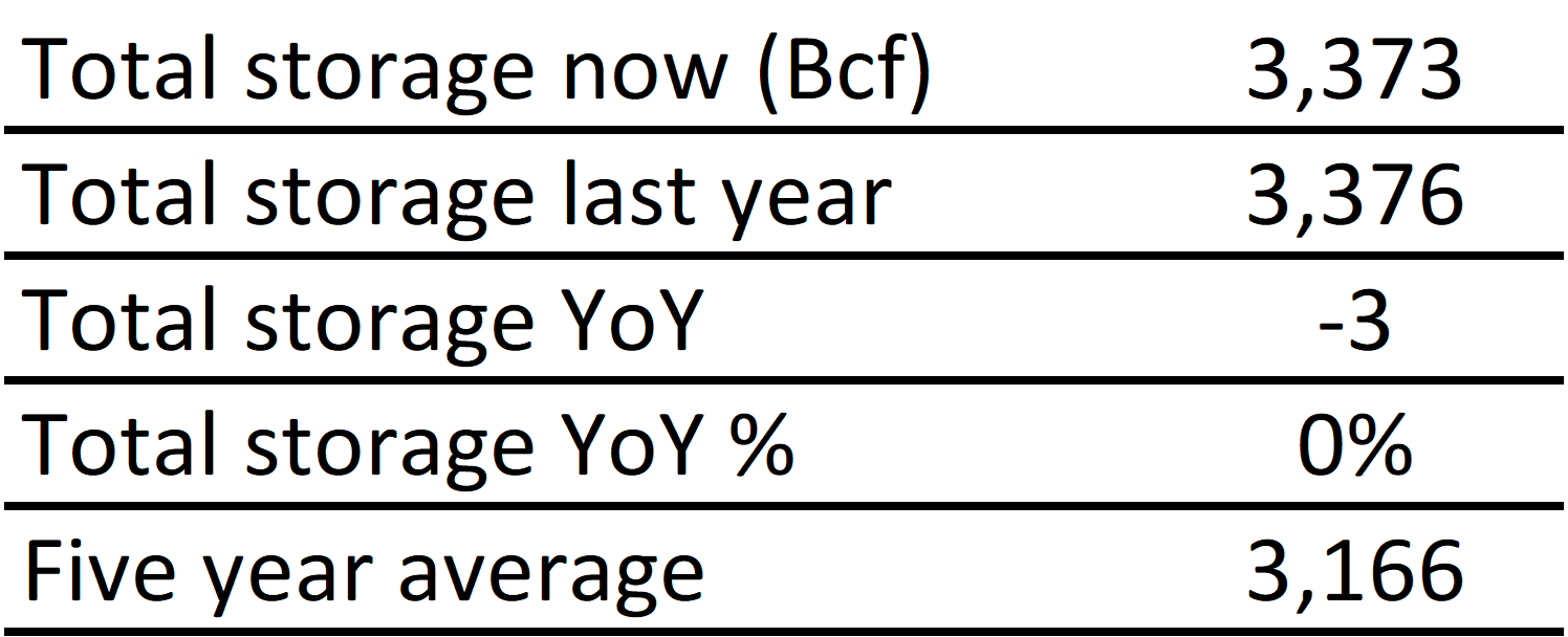 Inventories for the US are now at a deficit of 3 Bcf to last year and a surplus of 207 Bcf to the five-year average.
