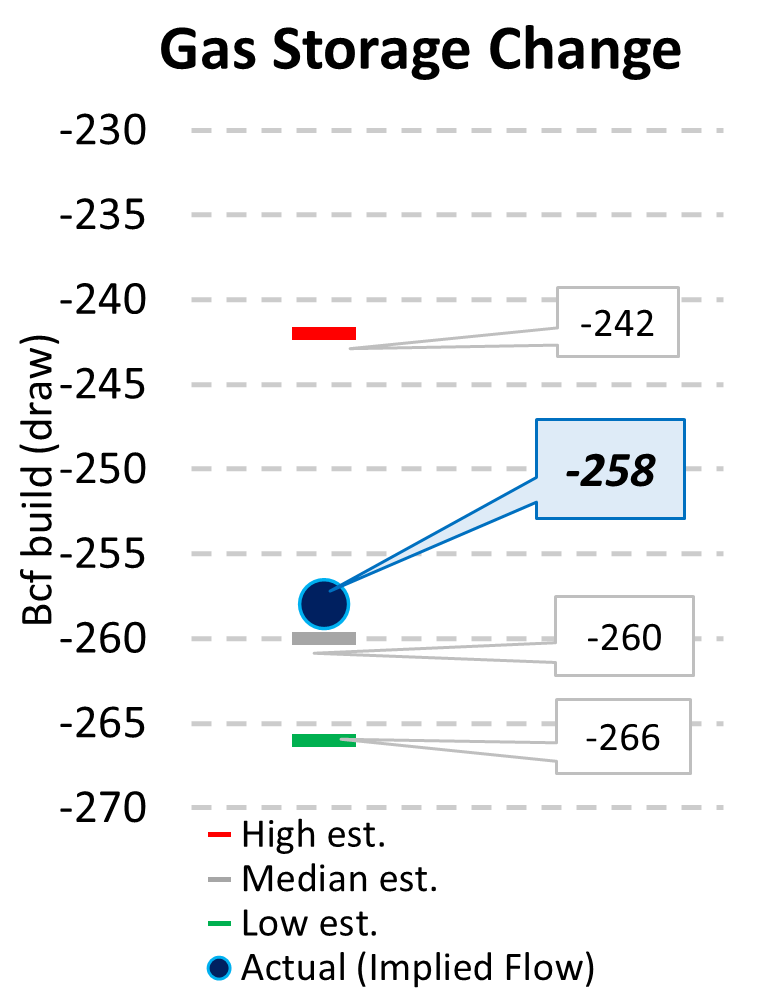 EIA reported a draw of -258 Bcf for the week ending 1/03/2025. This was smaller than the median estimate of -260 Bcf. Today's stat fell within the expected range, which was -242 Bcf on the more bearish end, and -266 Bcf on the more bullish end.
