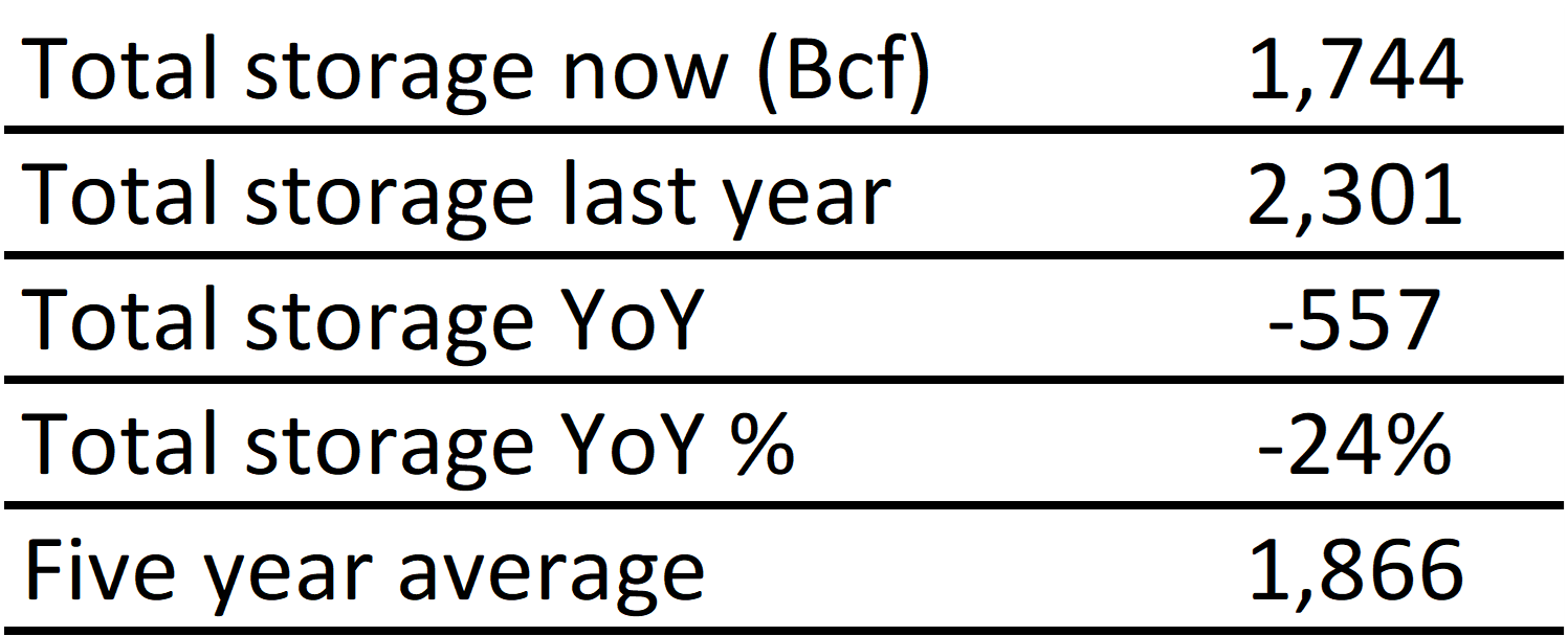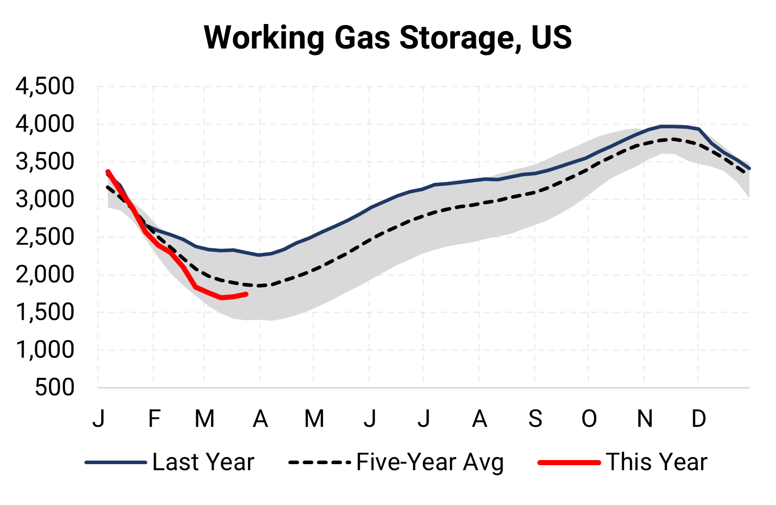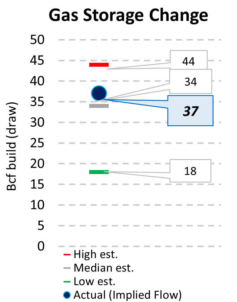 EIA reported a build of 37 Bcf for the week ending 3/21/2025. This was larger than the median estimate of 34 Bcf. Today's stat fell within the expected range, which was 44 Bcf on the more bearish end, and 18 Bcf on the more bullish end.