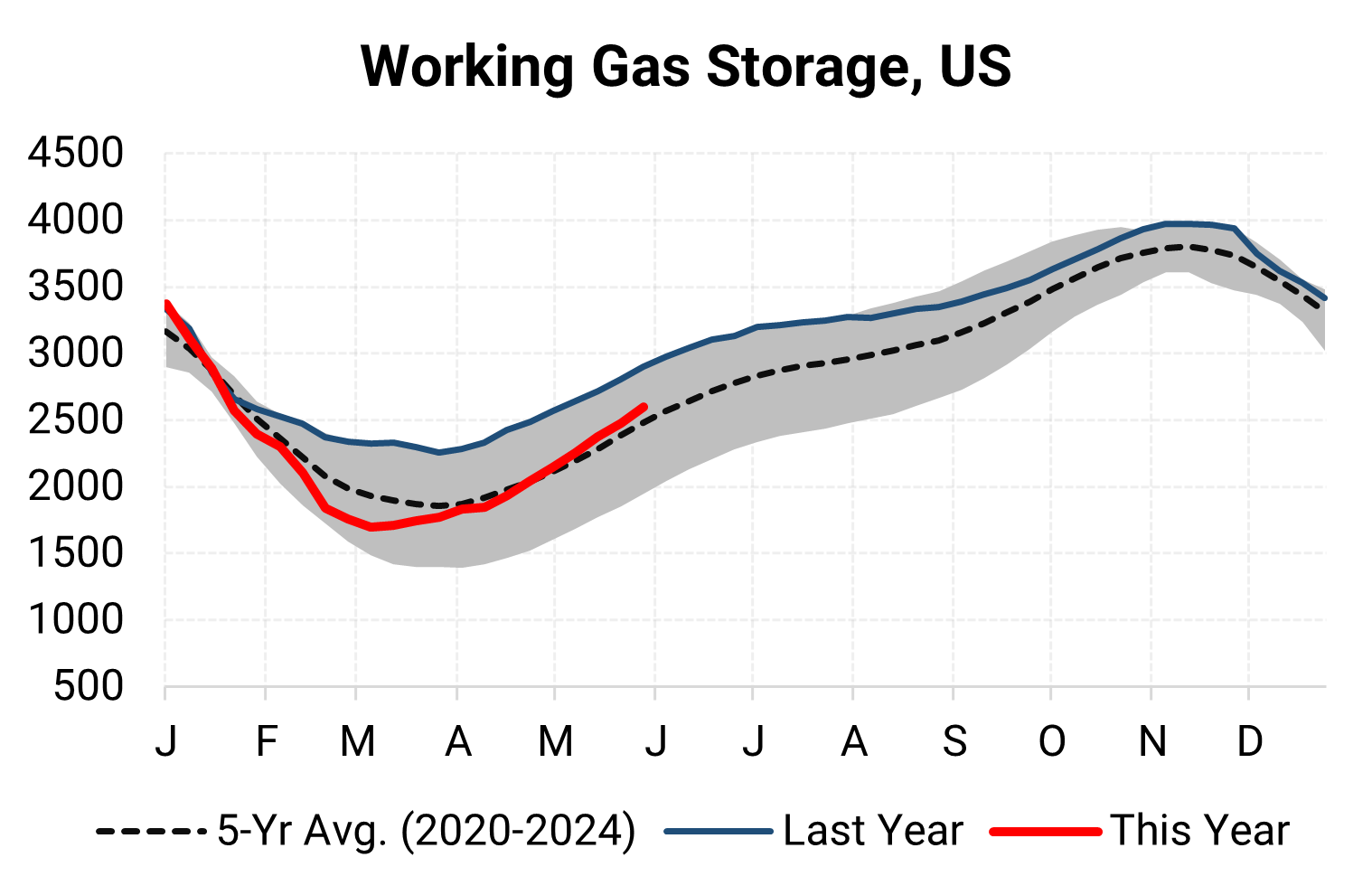 EIA reported a build of 122 Bcf for the week ending 5/30/2025. This was larger than the median estimate of 112 Bcf. Today's stat fell outside the expected range, which was 118 Bcf on the more bearish end, and 104 Bcf on the more bullish end.