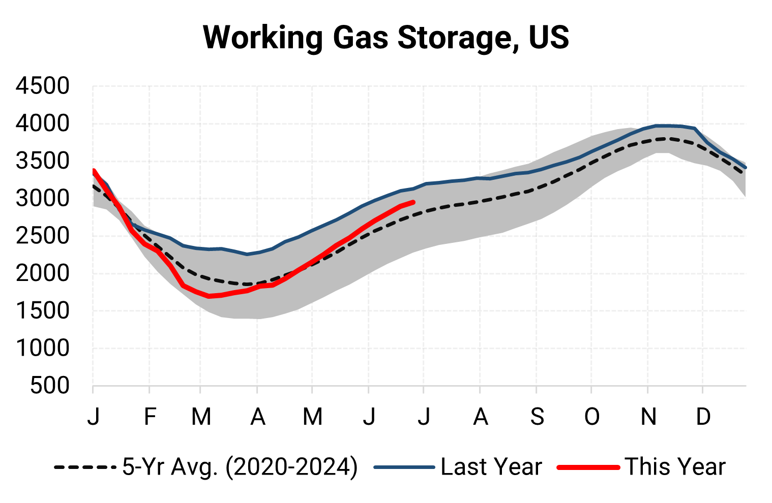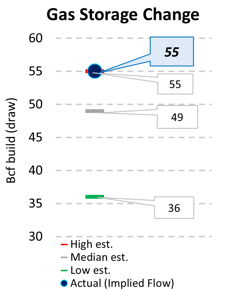 EIA reported a build of 55 Bcf for the week ending 6/27/2025. This was larger than the median estimate of 49 Bcf. Today's stat fell within the expected range, which was 55 Bcf on the more bearish end, and 36 Bcf on the more bullish end.