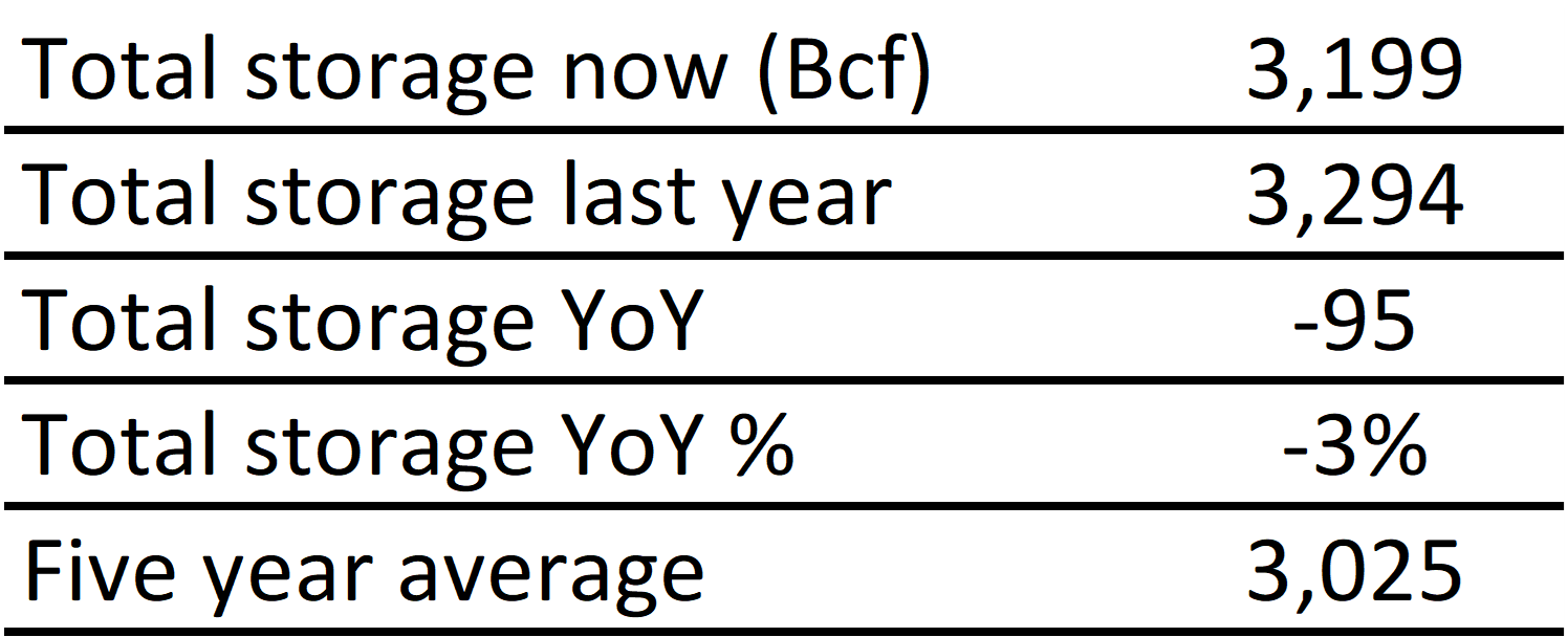 Inventories for the US are now at a deficit of 95 Bcf to last year and a surplus of 174 Bcf to the five-year average. |