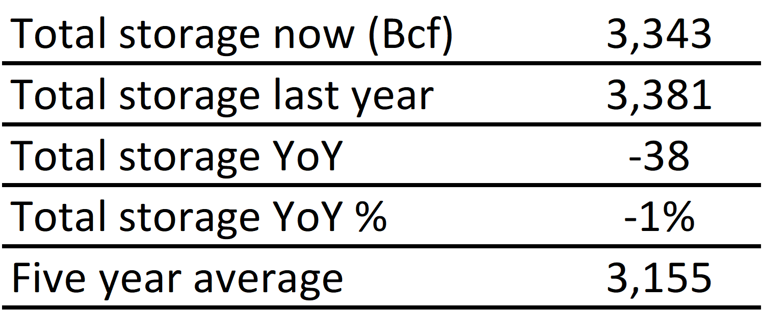 Inventories for the US are now at a deficit of 38 Bcf to last year and a surplus of 188 Bcf to the five-year average. |