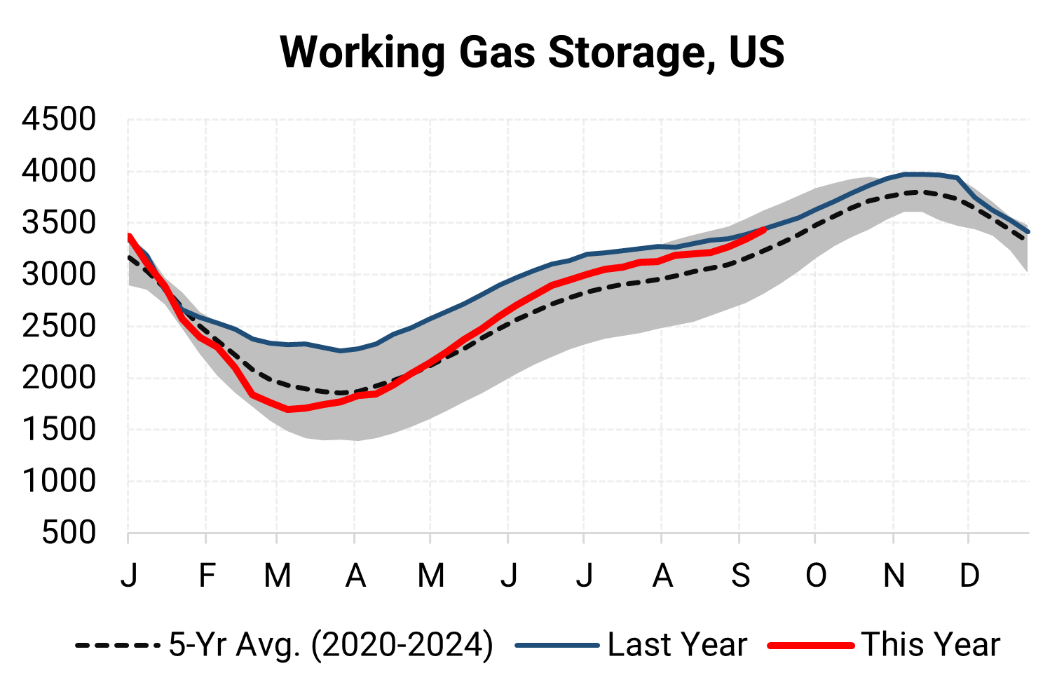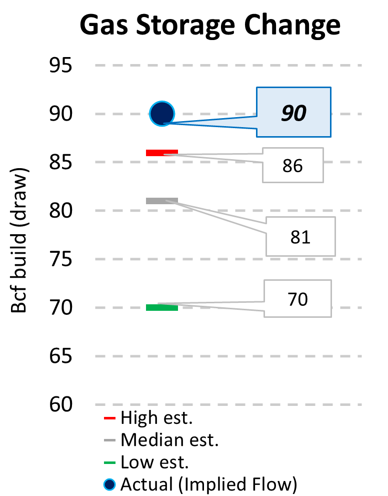 EIA reported a build of 90 Bcf for the week ending 9/12/2025. This was larger than the median estimate of 81 Bcf. Today's stat fell outside the expected range, which was 86 Bcf on the more bearish end, and 70 Bcf on the more bullish end.