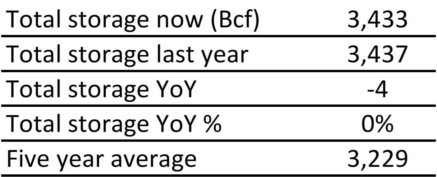 Inventories for the US are now at a deficit of 4 Bcf to last year and a surplus of 204 Bcf to the five-year average. |