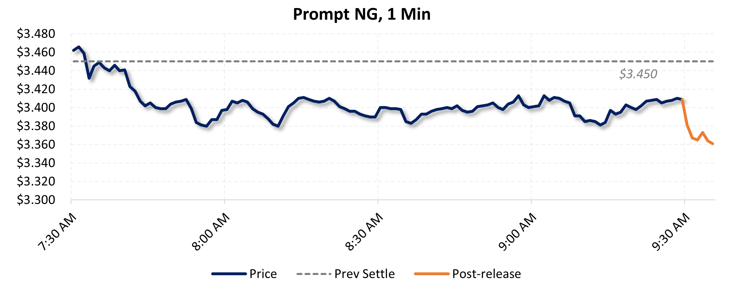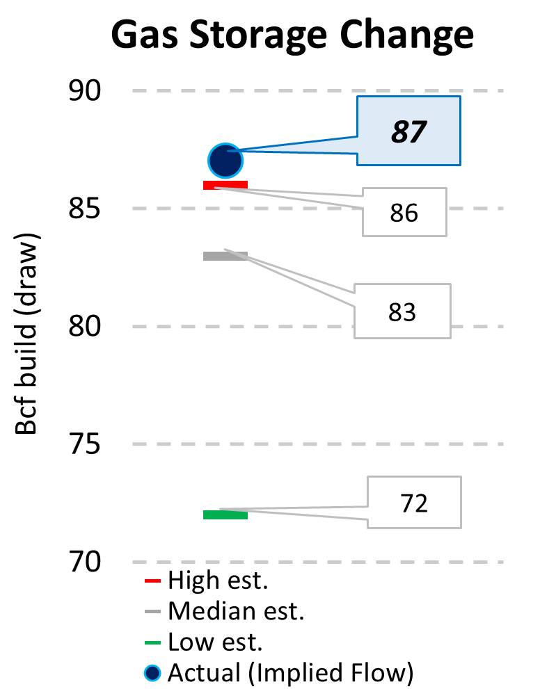 EIA reported a build of 87 Bcf for the week ending 10/17/2025. This was larger than the median estimate of 83 Bcf. Today's stat fell outside the expected range, which was 86 Bcf on the more bearish end, and 72 Bcf on the more bullish end.