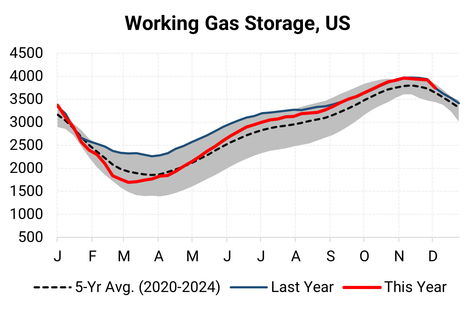 EIA reported a draw of -177 Bcf for the week ending 12/05/2025. This was larger than the median estimate of -167 Bcf. Today's stat fell within the expected range, which was -161 Bcf on the more bearish end, and -181 Bcf on the more bullish end.
