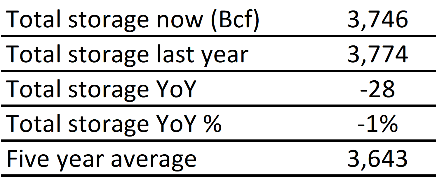 Inventories for the US are now at a deficit of 28 Bcf to last year and a surplus of 103 Bcf to the five-year average. |
