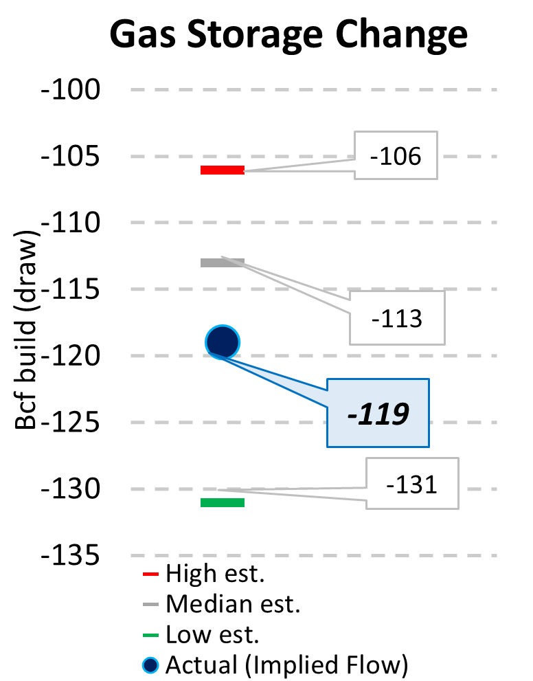 EIA reported a draw of -119 Bcf for the week ending 1/02/2026. This was larger than the median estimate of -113 Bcf. Today's stat fell within the expected range, which was -106 Bcf on the more bearish end, and -131 Bcf on the more bullish end.