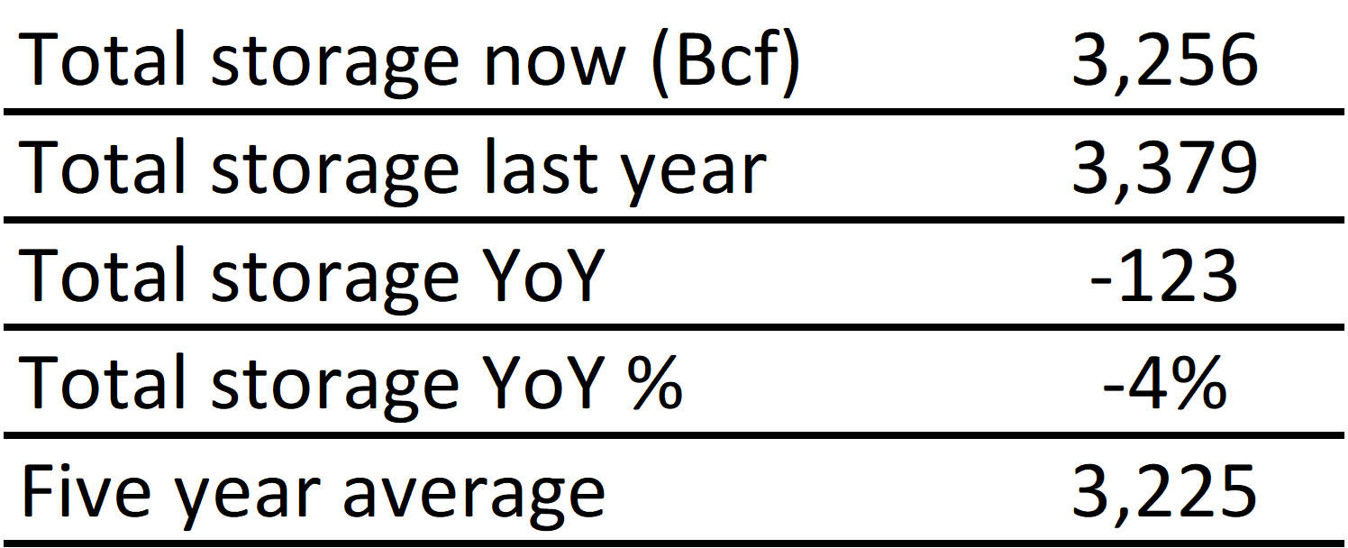 Inventories for the US are now at a deficit of 123 Bcf to last year and a surplus of 31 Bcf to the five-year average. |