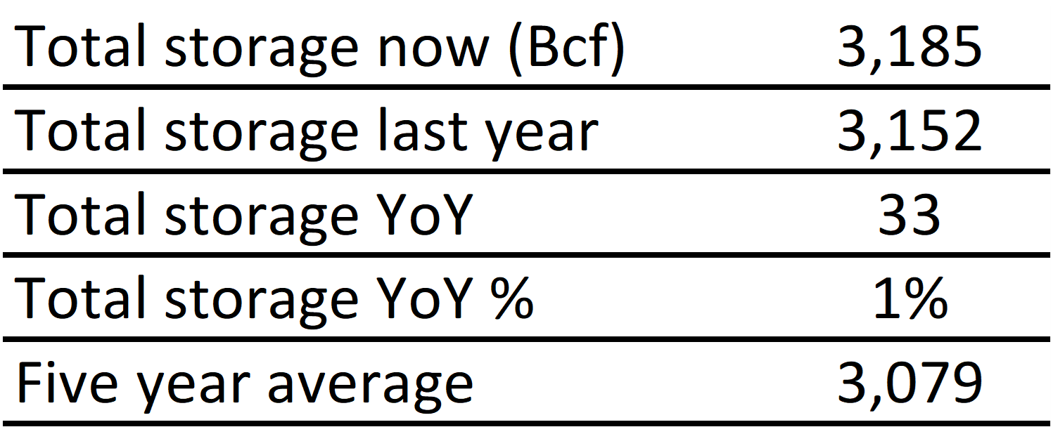 Inventories for the US are now at a surplus of 33 Bcf to last year and a surplus of 106 Bcf to the five-year average. |